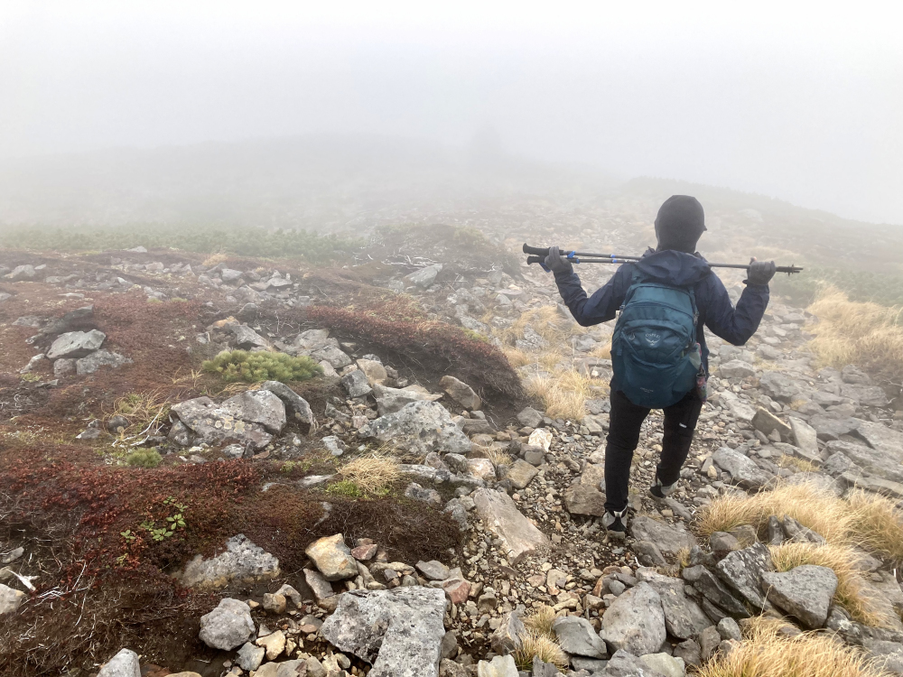 稜線は気温計では10℃前後、風も少しあり霧で日差しもなかったので止まると薄いフリースを着ていても少し寒く感じました。